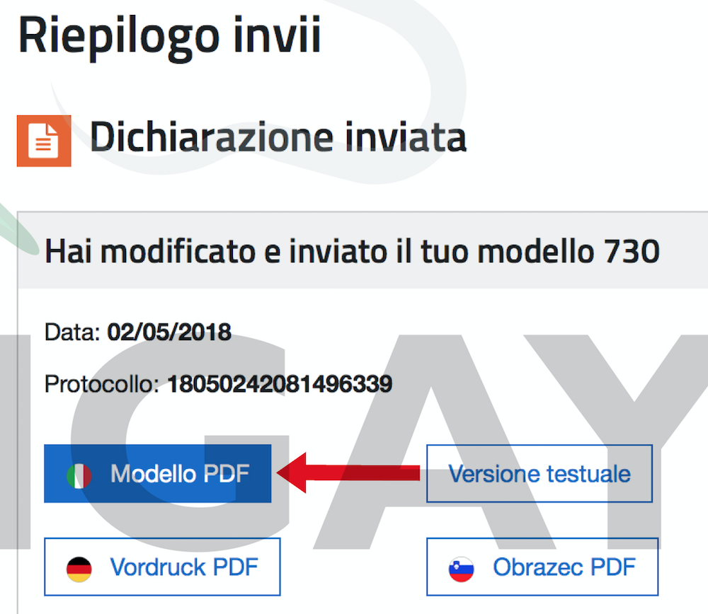 9. Il sistema rilascerà la ricevuta del protocollo a conferma del corretto invio del modello di dichiarazione. Nel medesimo riquadro sarà possibile scaricare in formato PDF il documento inviato all’ Agenzia delle Entrate